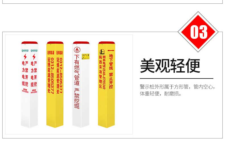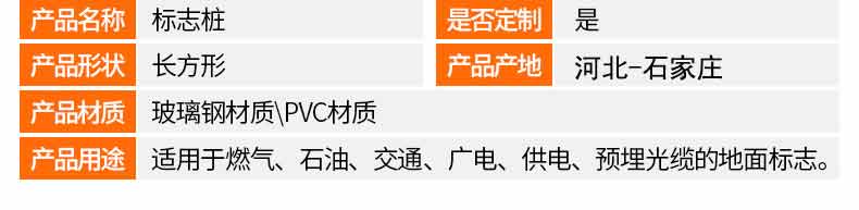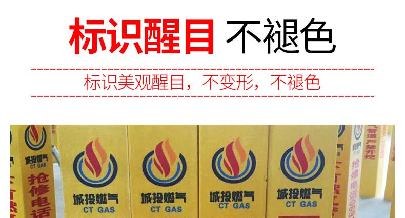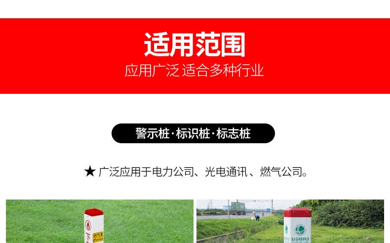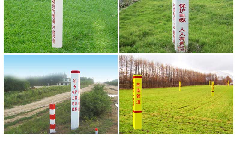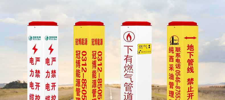 標志樁又稱為警示樁、標識樁、標志樁,常用于電力、通信、燃氣、自來水、鐵路地埋管線路徑指示標志。用于戶外、綠化帶、灌木叢、頂管兩側管線路徑指示,起到警示作用的新型產品。
