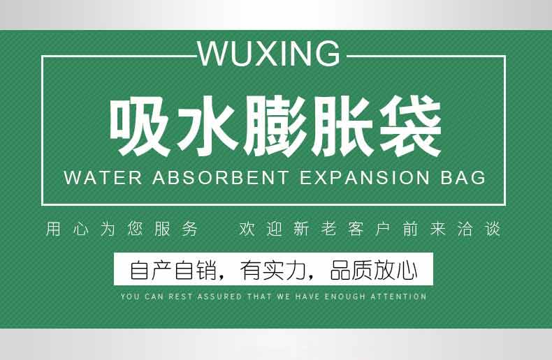 吸水膨脹袋內裝的是新型的高分子納米吸水物質,這種物質無毒、無味、無污染,吸水膨脹前為極小的顆粒物質,吸水后為黑豆大小的含水物質,干凈且無公害,待高分子吸水物質使用后可用于農業保水抗旱,所以在洪水過后可就地將袋內的物質傾倒入農田中,在泥土中可完全分解,是綠色環保、一舉兩得的首選產品。外袋為純麻布和棉布織成,遇水后麻繩可更加結實耐磨。