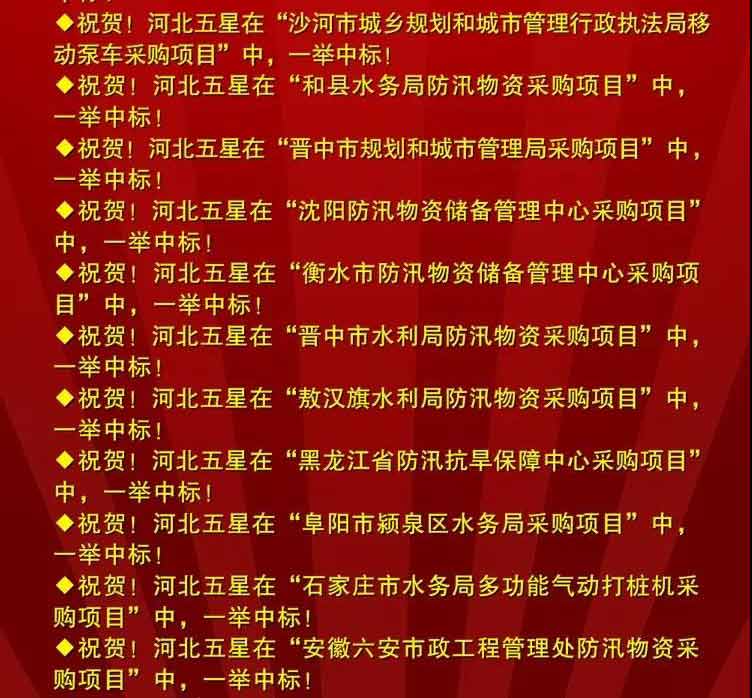 是我國防汛抗旱、搶險救災、應急減災救援和電力設備及安全工器具、市政設施、地下管網行業中,集科研、開發、生產、銷售及服務于一體的現代化技術裝備高新技術企業。我公司多次中標項目,榮譽成就屬于過去,河北五星永駐輝煌。